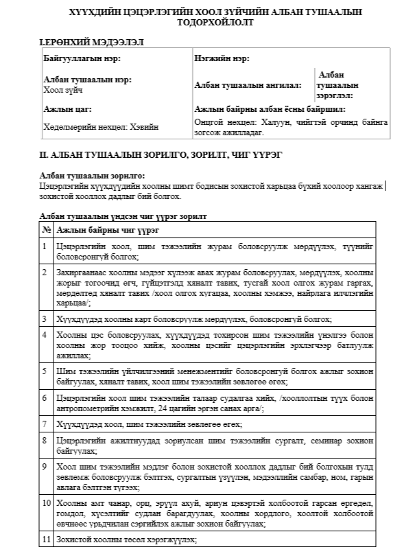 Гал тогооны ахуй орчинд эрүүл ахуйн стандарт шаардлагын дагуу цэвэрлэгээ ариутгал хийж, үйлчлүүлэгчдэд тав тухтай, эрүүл, аюулгүй, сэтгэл ханамжтай байх нөхцөлийг бүрэн хангаж ажиллана.
